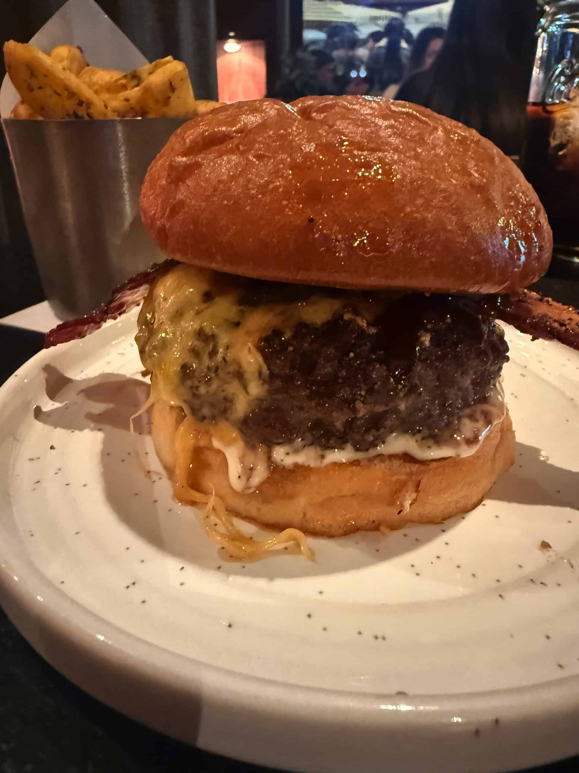 It’s a single meat patty with cheddar, BBQ sauce, bacon, caramelized onion and camembert cream. Now I wouldn’t be a massive fan of camembert, but I decided to take one for the team! Or my blog readers! I also ordered a side of fries. And a Coke Zero which was served in a massive Kilner type jar.